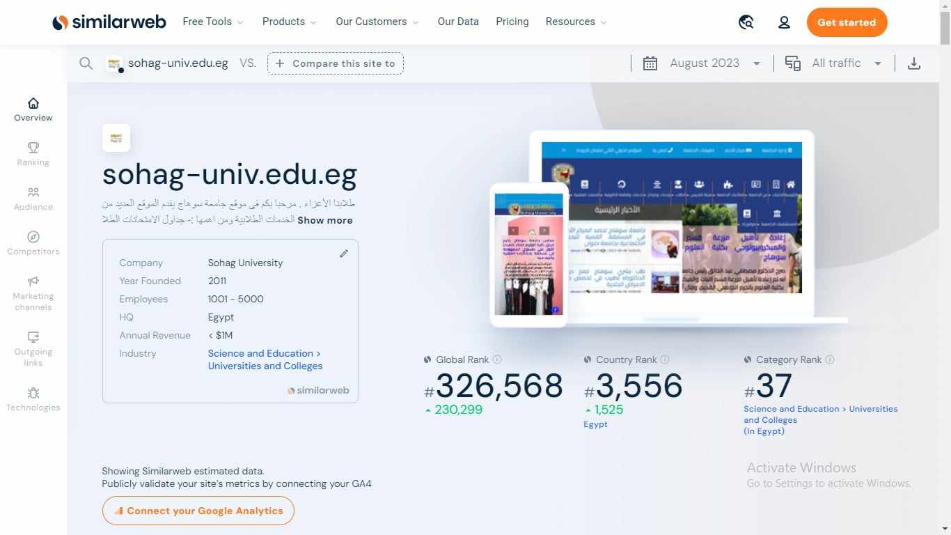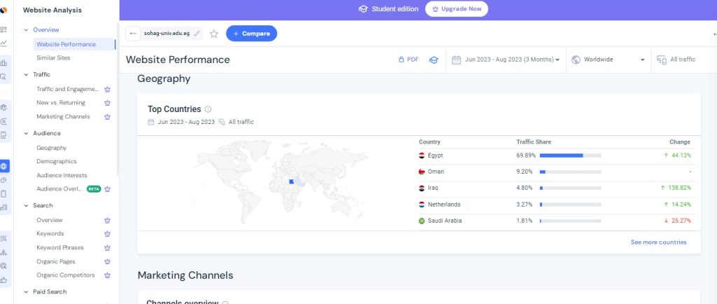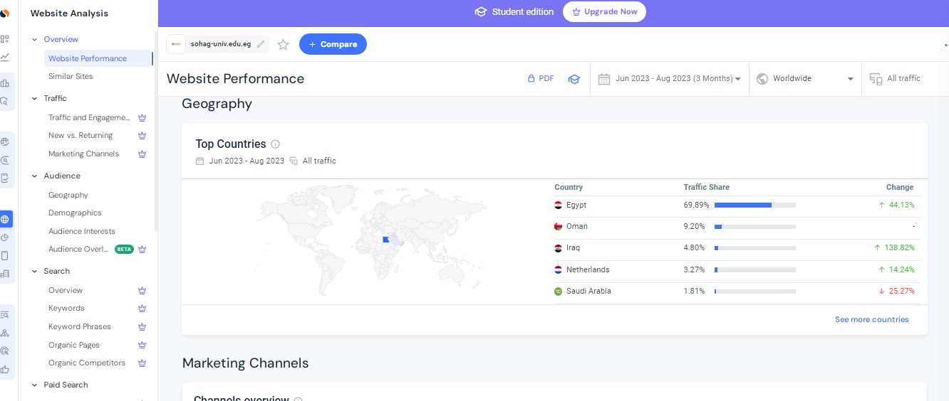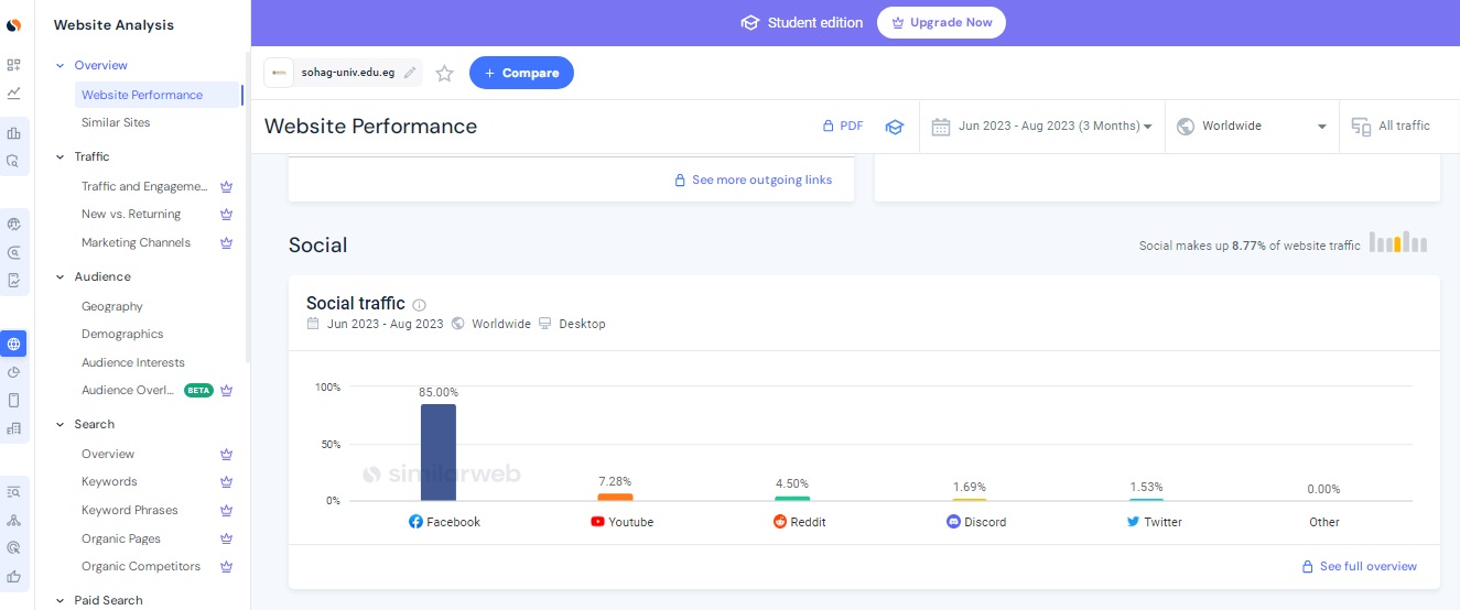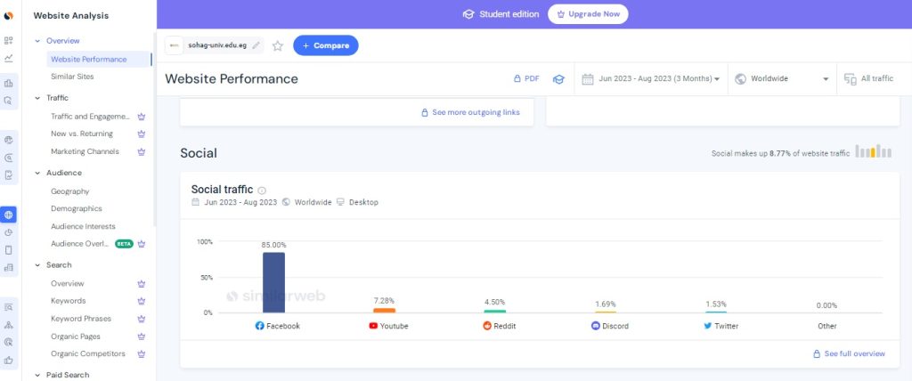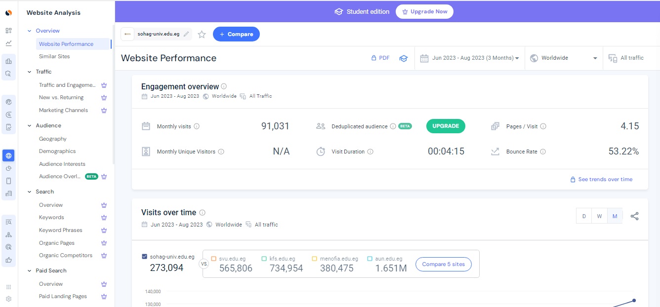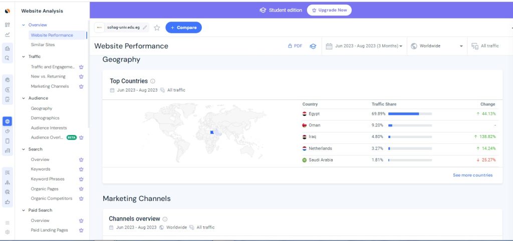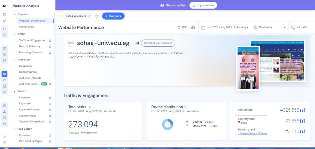 وقال الدكتور حسان النعماني  رئيس جامعة سوهاج أن موقع  Similar web من أهم المواقع المتخصصة في تحليل المواقع الالكترونية لانه يعطي تقييم كامل للموقع من حيث  العدد التقريبي لزيارات الموقع، معدل الإرتداد، عدد الصفحات التي تمت مشاهدتها في  الجلسة الواحدة على الموقع  و مدة  بقائه ، أهم مصادر الزيارات، وتفاصيل عن  الزوار ( البلد، اللغة المستخدمة، الاهتمامات)،  أهم قنوات التواصل الإجتماعي التي تجلب  زيارات للموقع.