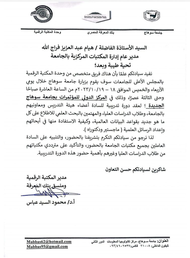 كما تدعو الاستاذة الدكتور هيام عبد العزيز فراج مدير عام إدارة المكتبات المركزية بجامعة سوهاج السادة أعضاء هيئة التدريس و السادة العاملين بالمكتبات الجامعية لحضور الدورة التدريبية المقامة بالمركز الدولى للمؤتمرات بجامعة سوهاج الجديدة ( الكوامل ) من السادة العاشرة صباحا يومي الاربعاء و الخميس 18-19/10/2023 .
