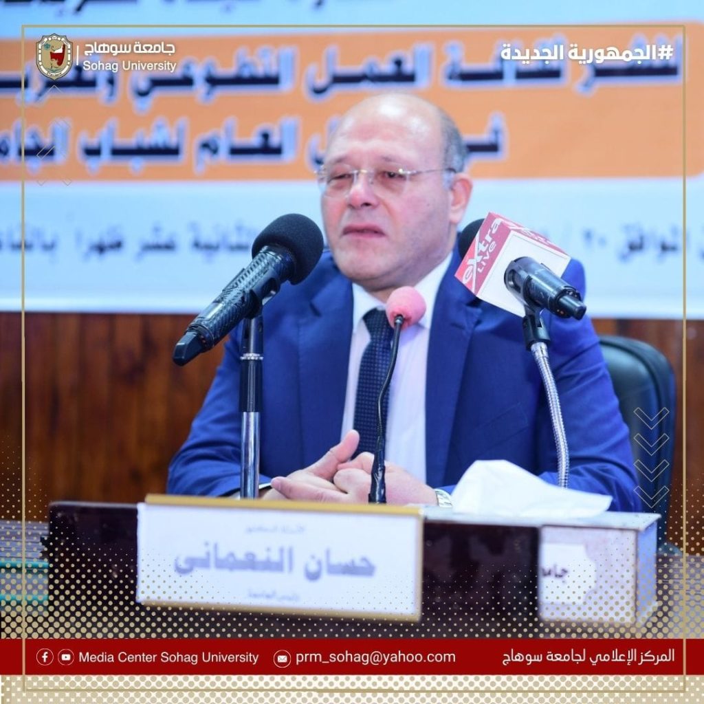 At the beginning of his speech, Colonel Muhammad Kamal directed his thanks and appreciation to prof. Hassan Al-Noamani for the fruitful cooperation between the university and the Hayat Karima Foundation, stressing that Sohag University is the first and primary supporter and partner in all the achievements and success of what the Hayat Karima Foundation is implementing within the governorate, indicating that this symposium is being organized with the aim of developing university students’ awareness of the achievements and development efforts, spreading the culture of volunteer work, and involving them in the work carried out by the initiative.