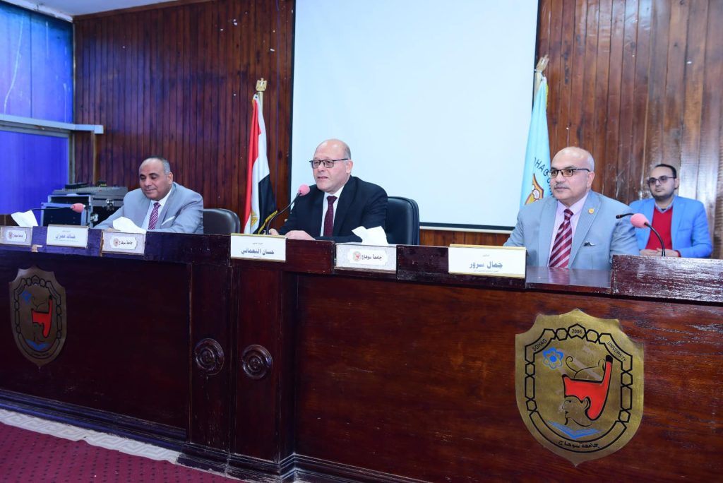 Dr. Hassan Al-Noamany, President of Sohag University, witnessed the celebration activities of the university’s central administrations, and the faculties of Arts, Sciences, Commerce, Agriculture, Nursing, Medicine, and Pharmacy, obtaining the international ISO 9001 certificates for the year 2015 for the administrative work system, and also ISO 21001 for the year 2018 and the private ones with the quality of the educational process, which was held in the glass conference hall at the old university headquarters, in the presence of Dr. Khaled Omran, Vice President of the University for Community Service and Environmental Development Affairs, the accountant Ashraf Al-Qadi, Secretary-General of the University, Dr. Jamal Sorour, Director of the Development and Performance Evaluation Department to ensure quality, and an elite group of deans and staff members, unit directors, project officials in faculties and central schools, and a large group of employees in the administrative apparatus.