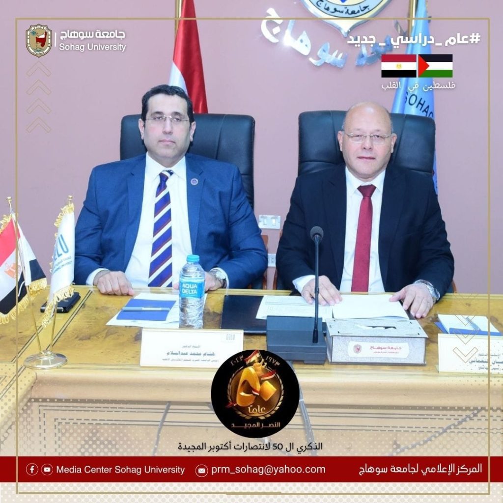 Prof. Hassan Al-Noamani, President of Sohag University, met with Prof. Hisham Abdel Salam, President of the Egyptian E-Learning University, to follow up the academic follow-up of joint programs and work mechanisms between the two sides during the coming period, in the presence of prof. Abdel Nasser Yassin and prof. Khaled Omran, Vice Presidents of the University, and prof. Mahmoud Shoman, Vice Presidents of Egyptian University for Academic Affairs