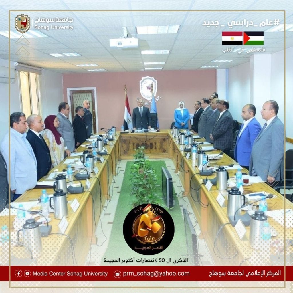 Prof. Hassan Al-Numani, President of Sohag University, began the 198th University Council Meeting by holding a minute of silence for the souls of the martyrs of our Palestinian brothers, after the Israeli violations witnessed in the Gaza Strip over the past days, in the presence of prof. Abdel Nasser Yassin, Vice President of the University for Education and Student Affairs, and prof. Khaled Omran, Vice President of the University of the University for Community Service and Environmental Development Affairs, the accountant Ashraf El-Qadi, the Secretary-General of the University, and the deans of the faculties.