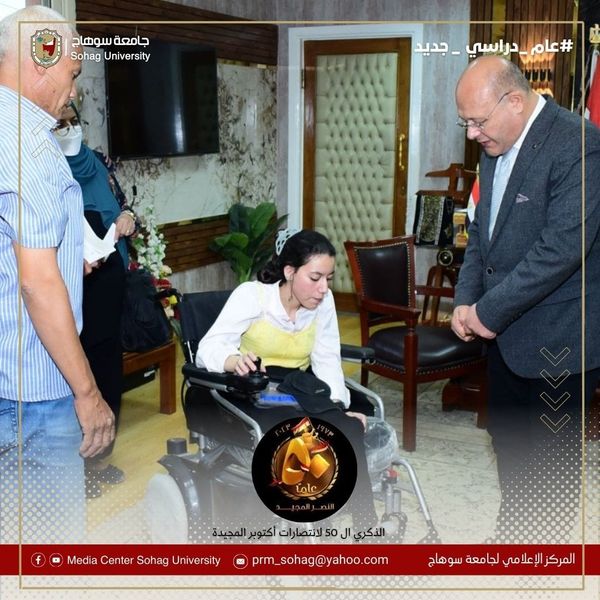 Sohag University donated an electric wheelchair to Bassant Abu Al-Wafa, a student at faculty of Arts, as part of the university administration’s keenness to provide all means of support and social care to its students with disabilities, and to overcome the obstacles facing them, to facilitate the educational process and avoid the hardship of going and returning to and from the university headquarters.
