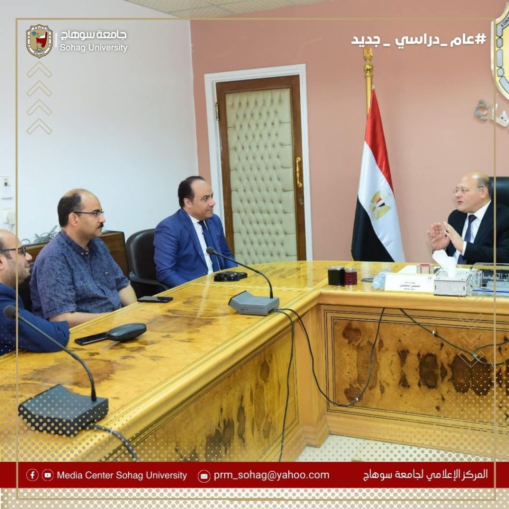 Prof. Hassan Al-Noamani, President of Sohag University, received Dr. Ahmed Hassan Abu Hashem, Undersecretary of the Ministry of Health in Sohag, Dr. Ahmed Abdel Karim, Undersecretary of the Directorate of Health and Population in the governorate, and Dr. Hassan Mahrous, Director General of Therapeutic Medicine in the Directorate, to discuss mechanisms for signing a cooperation protocol between the Directorate of Health Affairs and the university represented by the faculties (medicine, dentistry, pharmacy, and nursing), to support the health sector and eliminate waiting lists.