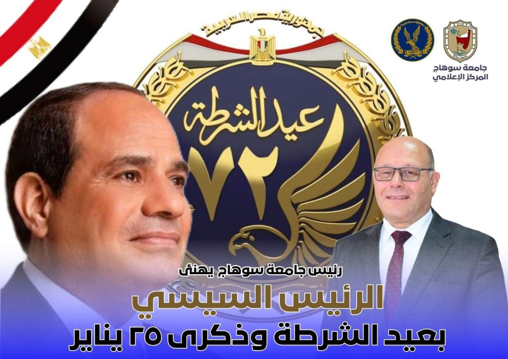Dr. Hassan Al-Noamani, President of Sohag University, congratulated President Abdel Fattah El-Sisi, the President of the Republic, on the occasion of the celebration of the 72nd Police Day, and the anniversary of January 25, led by the pure youth of Egypt, stressing that history will mention President El-Sisi with appreciation and gratitude for his keenness to strengthen the pillars of the Egyptian state and maintain  the security of the homeland and its stability, and the constant endeavor to advance the national development process for the sake of a bright tomorrow for our dear homeland.