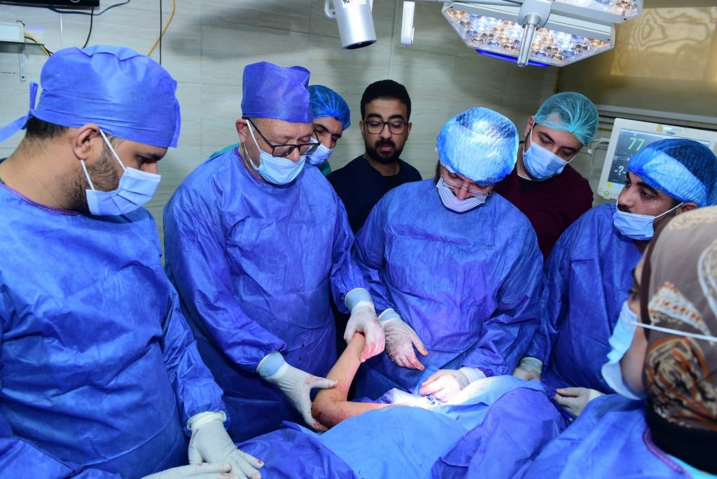 Prof. Hassan Al-Noamani, President of Sohag University, and Professor of Orthopedic, Traumatology, and Microscopic Surgery, and the medical team accompanying him in the Hand Surgery and Microscopic Surgery Unit at Faculty of Medicine, and the professors of anesthesia, performed surgery for an 11-year-old girl, who was injured.