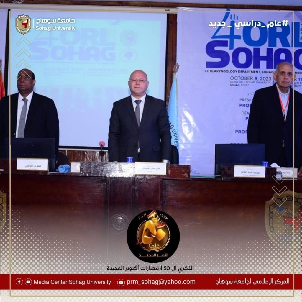 Prof. Hassan Al-Noaman, President of Sohag University, witnessed the activities of the fourth conference of Department of Ear, Nose, and Throat at Faculty of Medicine, with the participation of a group of ENT professors from various Egyptian universities, and in the presence of Prof. Magdy El-Kady, Dean of the faculty, and Prof. Abdel-Mateen Moussa, former President of South Valley University, and President of Sohag University and honorary guests for the conference were Prof. Mohamed Abdel Qader, head of the department and president of the conference, Dr. Sami Al-Najjar, Undersecretary of the Ministry of Health in Sohag, Dr. Mohamed Hassan, director of Health Insurance in the Governorate, Dr. Ibrahim Rizk, Secretary-General of the Conference, and a group of professors and specialists from Egyptian universities, in the glass hall of the old campus.