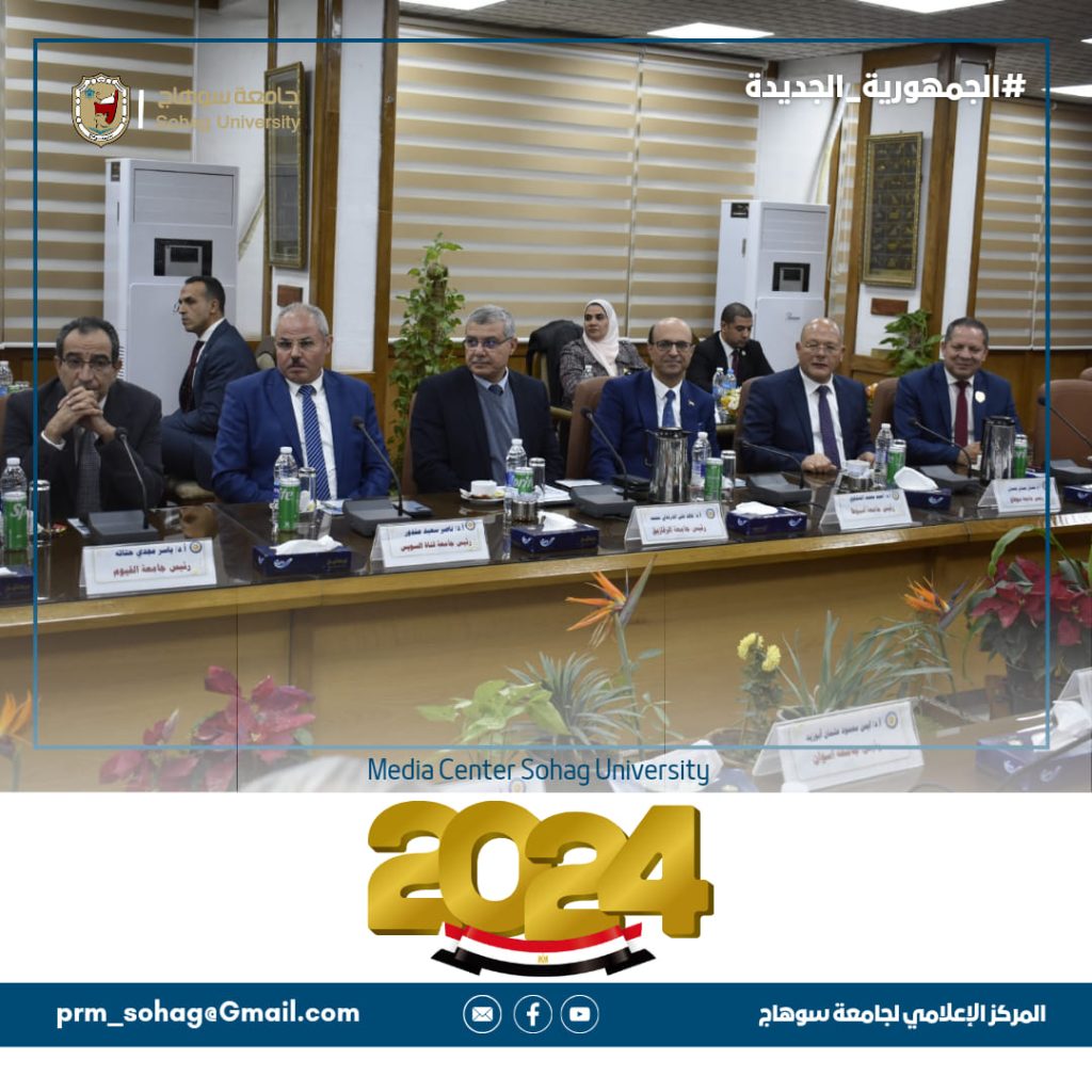 Dr. Hassan Al-Noamani, President of Sohag University, participated in the meeting of the Supreme Council of Universities, headed by Dr. Mohamed Ayman Ashour, Minister of Higher Education and Scientific Research, which was held at Minya University, in the presence of Major General Osama Al-Qadi, Minya Governor, Dr. Mostafa Refaat, Secretary of the Council, and Dr. Essam. Farhat, President of Minya University and heads of the public universities.