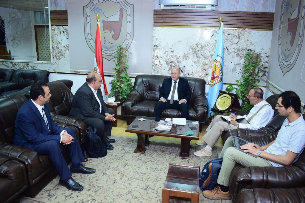 Dr. Hassan Al-Nomani, President of Sohag University, received a delegation from the Project Evaluation and Follow-up Committee of the United States Agency for International Development (AMIDEAST), which included Dr. Abdel Hamid Mahmoud Lotfy, Dr. Ahmed Mohamed Ahmed Selim, Ayman Ahmed Al-Husseini, and Dr. Tariq Zaki, Director of the Service Center for Students with Disabilities at the university, at the university’s headquarters.