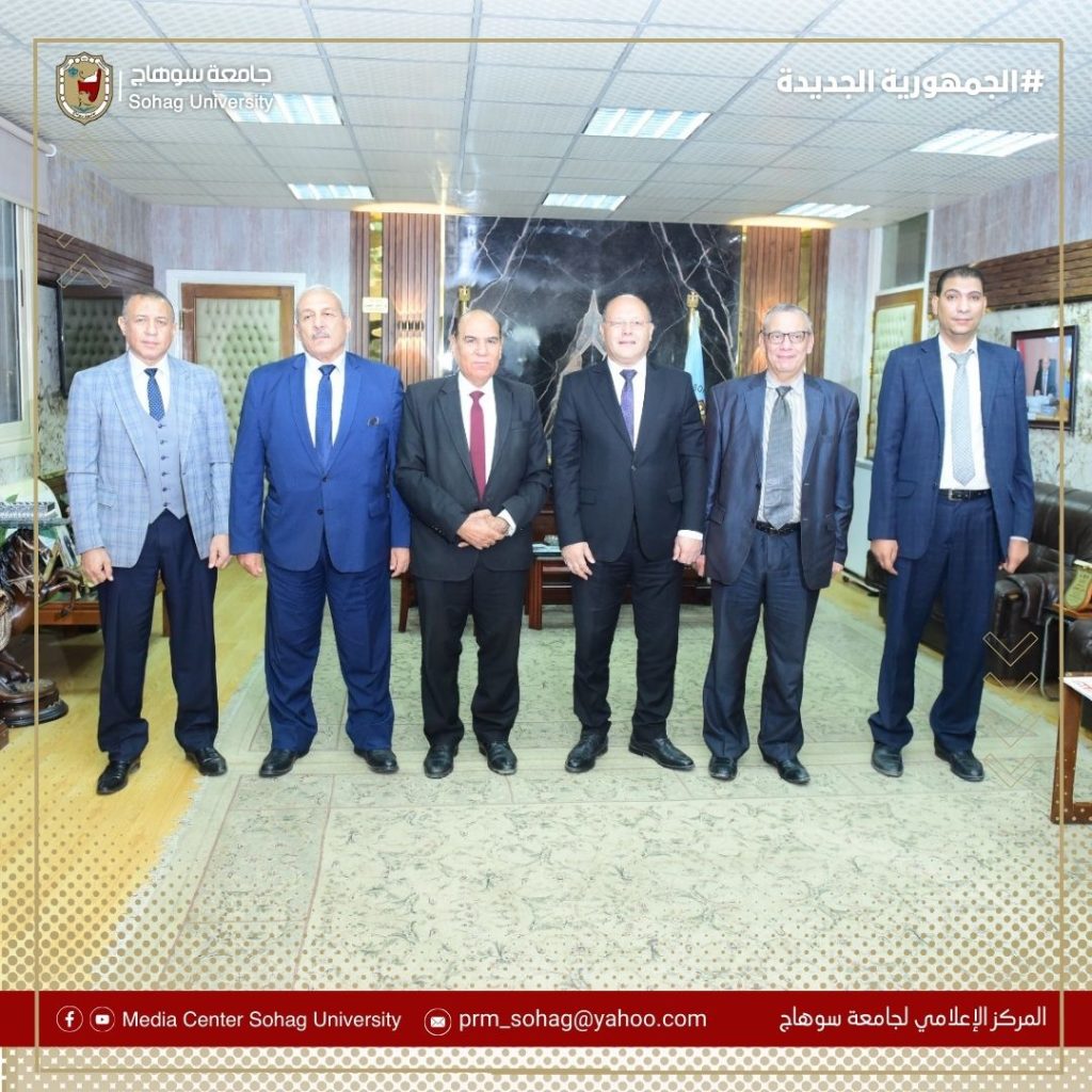 Prof. Hassan Al-Noamani, President of Sohag University, received a delegation from the Sector Committee of the Supreme Council of Universities, in order to determine the financial and human capabilities to begin studies at the Faculty of Graduate Studies and Environmental Research “on the credit hour system”, in the presence of prof. Hamdi Hassanein, Acting Dean of the Faculty, prof. Hazem Al-Mashanab, Dean of the Faculty of Science, and Dr. Hamdi Al-Sharif, Vice Dean of the faculty for Postgraduate Studies and Research.