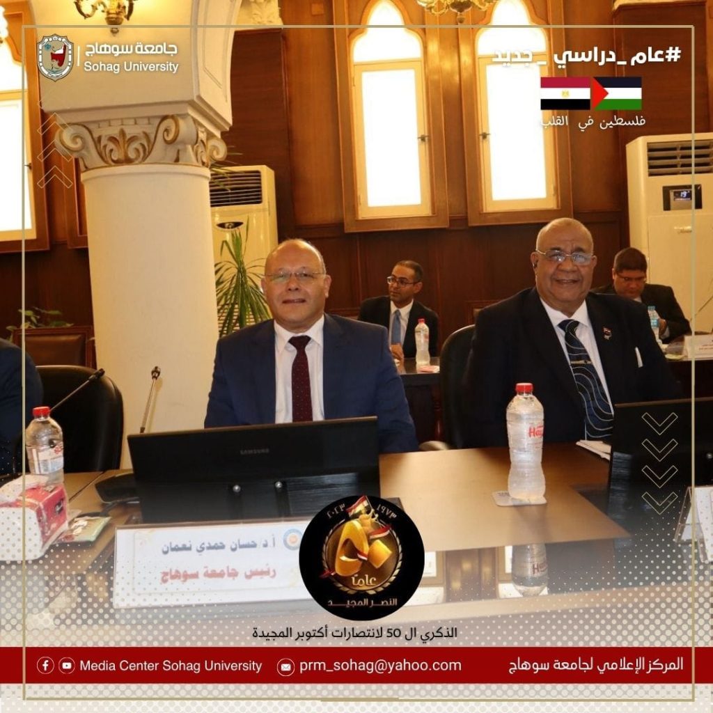 Prof. Hassan Al-Noamani, President of Sohag University, participated in the monthly meeting of the Supreme Council of Universities, headed by Dr. Ayman Ashour, Minister of Higher Education and Scientific Research, Dr. Mustafa Refaat, Secretary of the Supreme Council of Universities, and the heads of public universities which was held at the University of Alexandria.