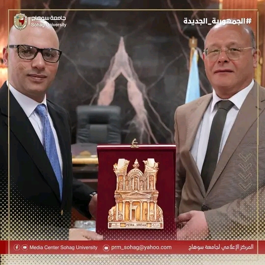 Prof. Hassan Al-Noamani, President of Sohag University, received Dr. Abdullah Al-Harahsheh, the cultural attaché of the Embassy of the Hashemite Kingdom of Jordan in Cairo, a Jordanian delegation and a number of students coming from the Kingdom, at his office on the old university campus.