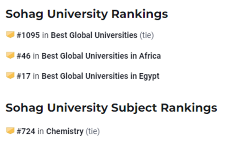 وقد حصدت جامعة سوهاج في تصنيف 2022-2023 علي المركز 1095 عالميا و المركز 46 في تصنيف افضل الجامعات في افريقيا و المركز 17 في تصنيف افضل الجامعات بجمهورية مصر العربية, ولقد تميزت جامعة سوهاج في مجال الكيمياء (Chemistry) علي المركز 724 بين جامعات العالم.